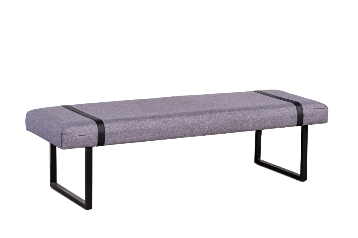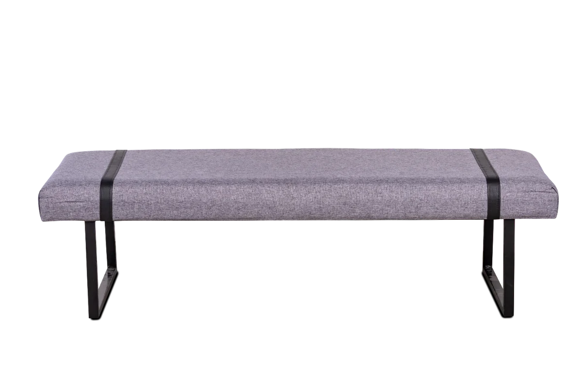 Banco puff industrial em linho cinza e detalhes em couro preto com estrutura em aço preto.