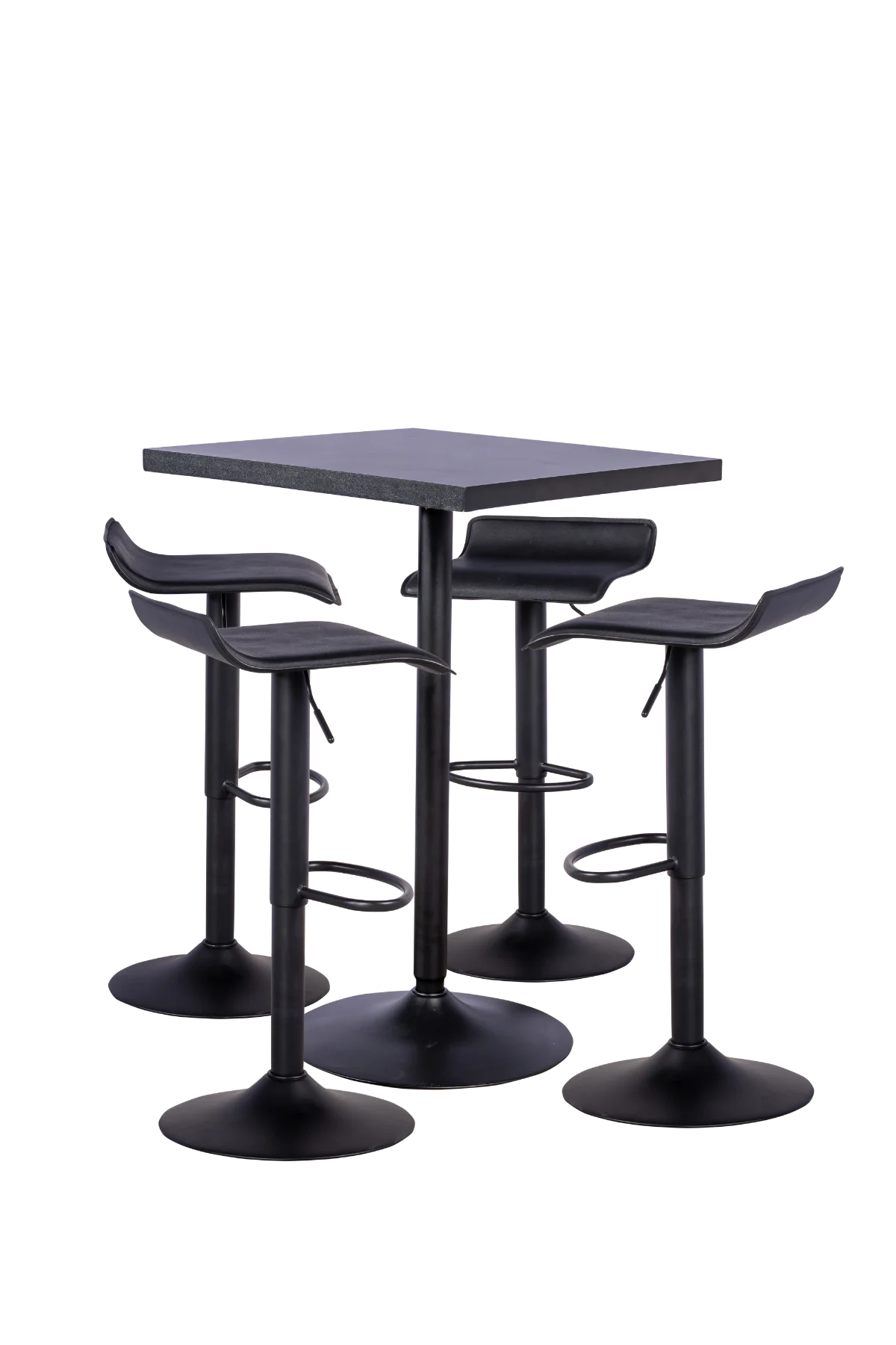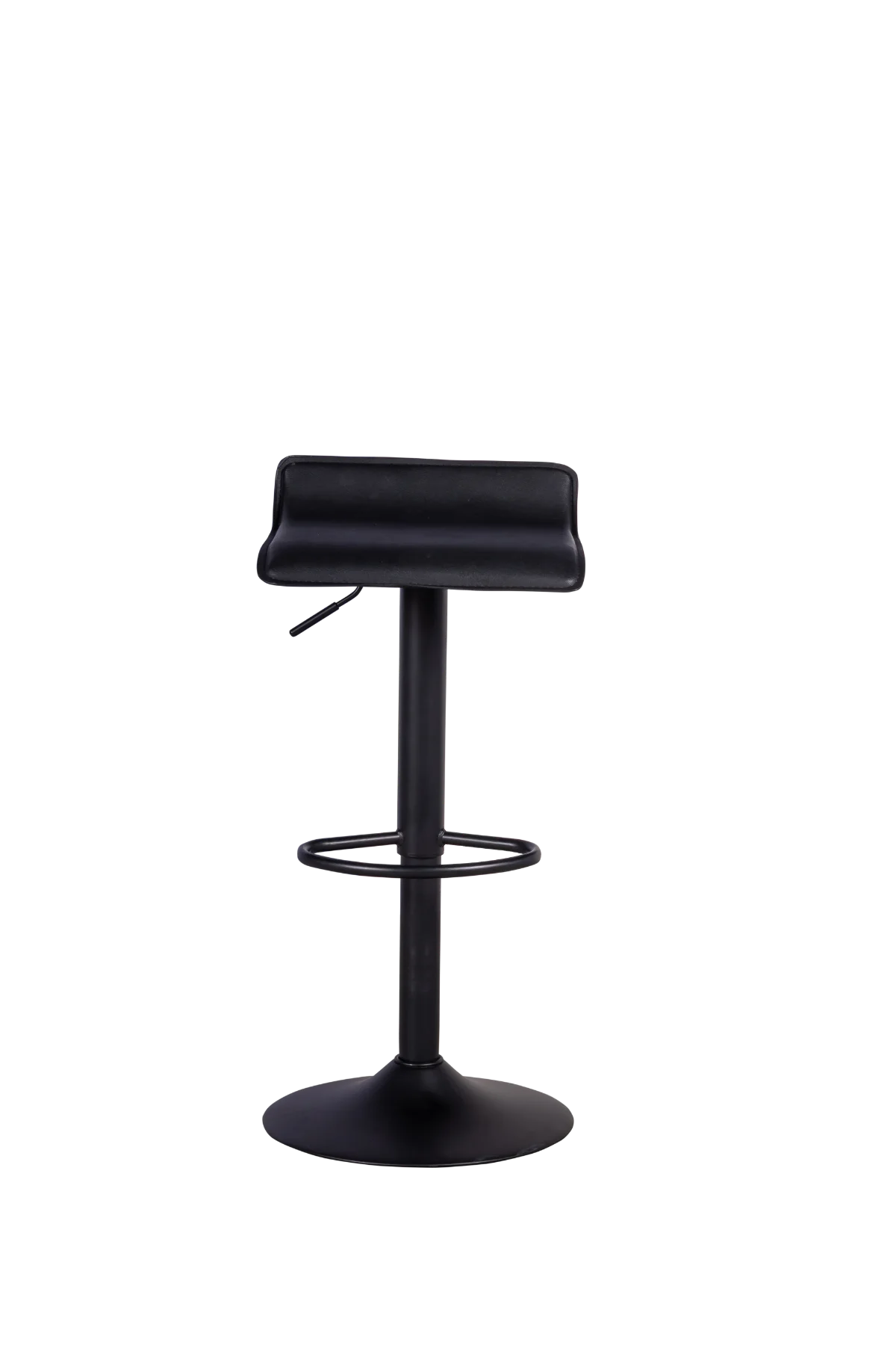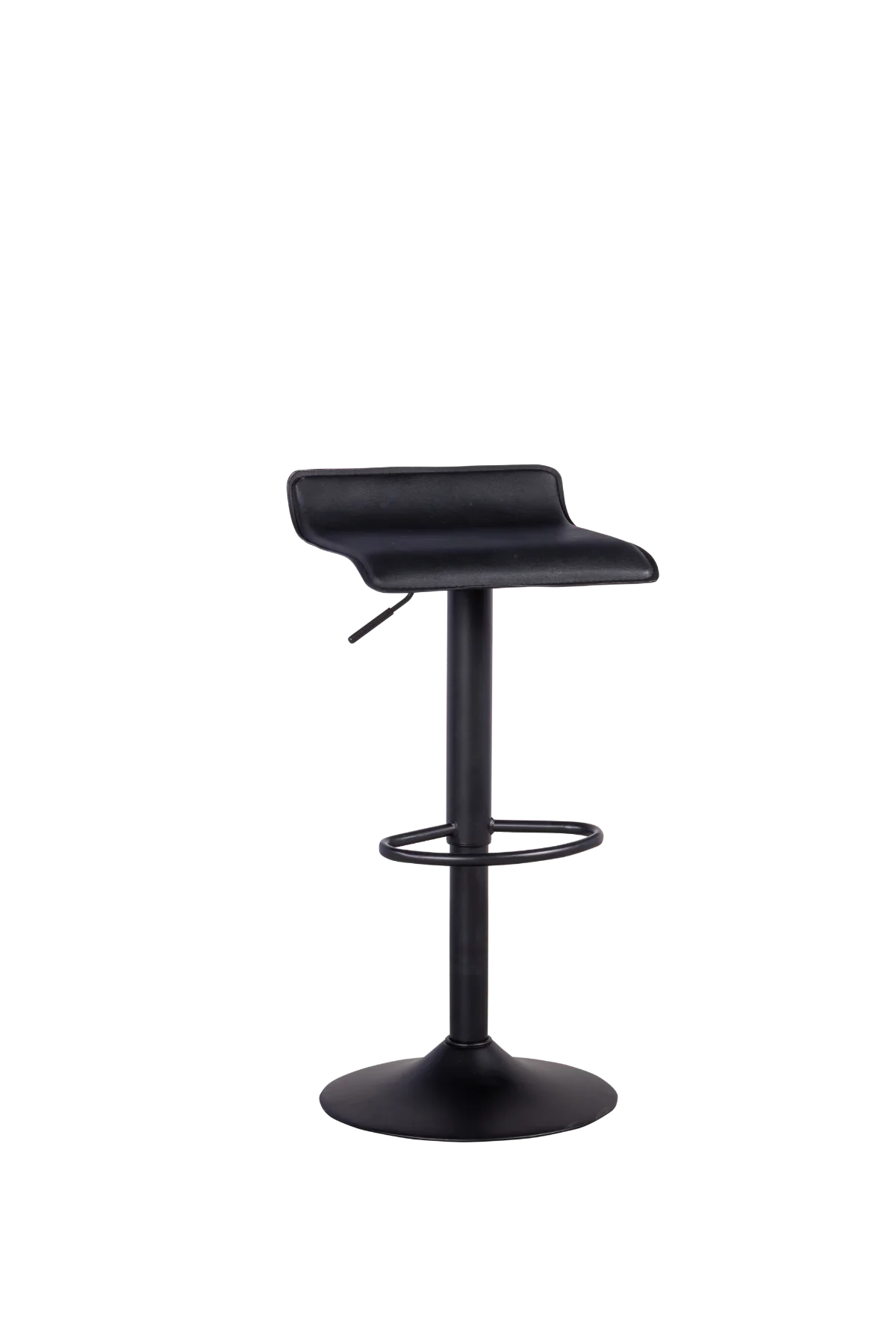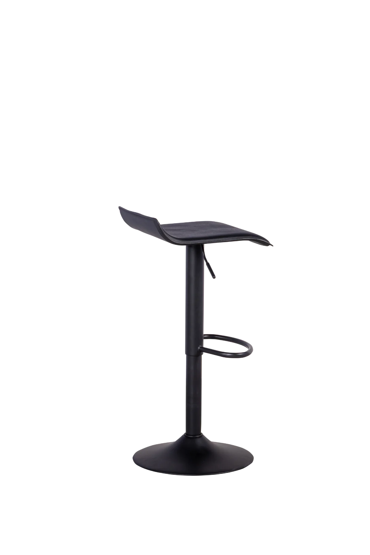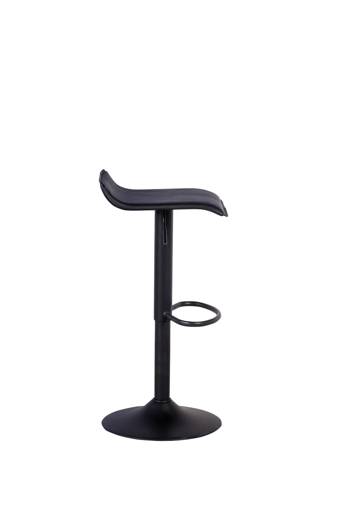 Banqueta bistrô, estrutura em aço carbono na cor preta, assento com regulagem de altura e giratório, acabamento em couro sintético preto.