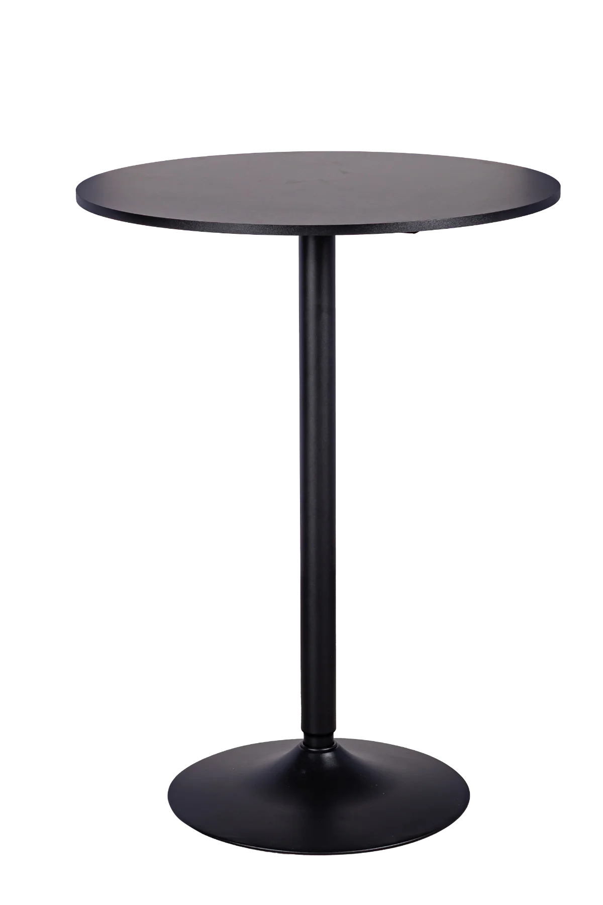 Mesa bistrô com base metal na cor preto fosco e tampo redondo em MDF preto.