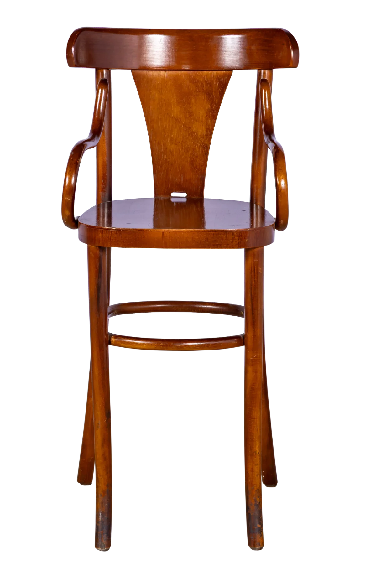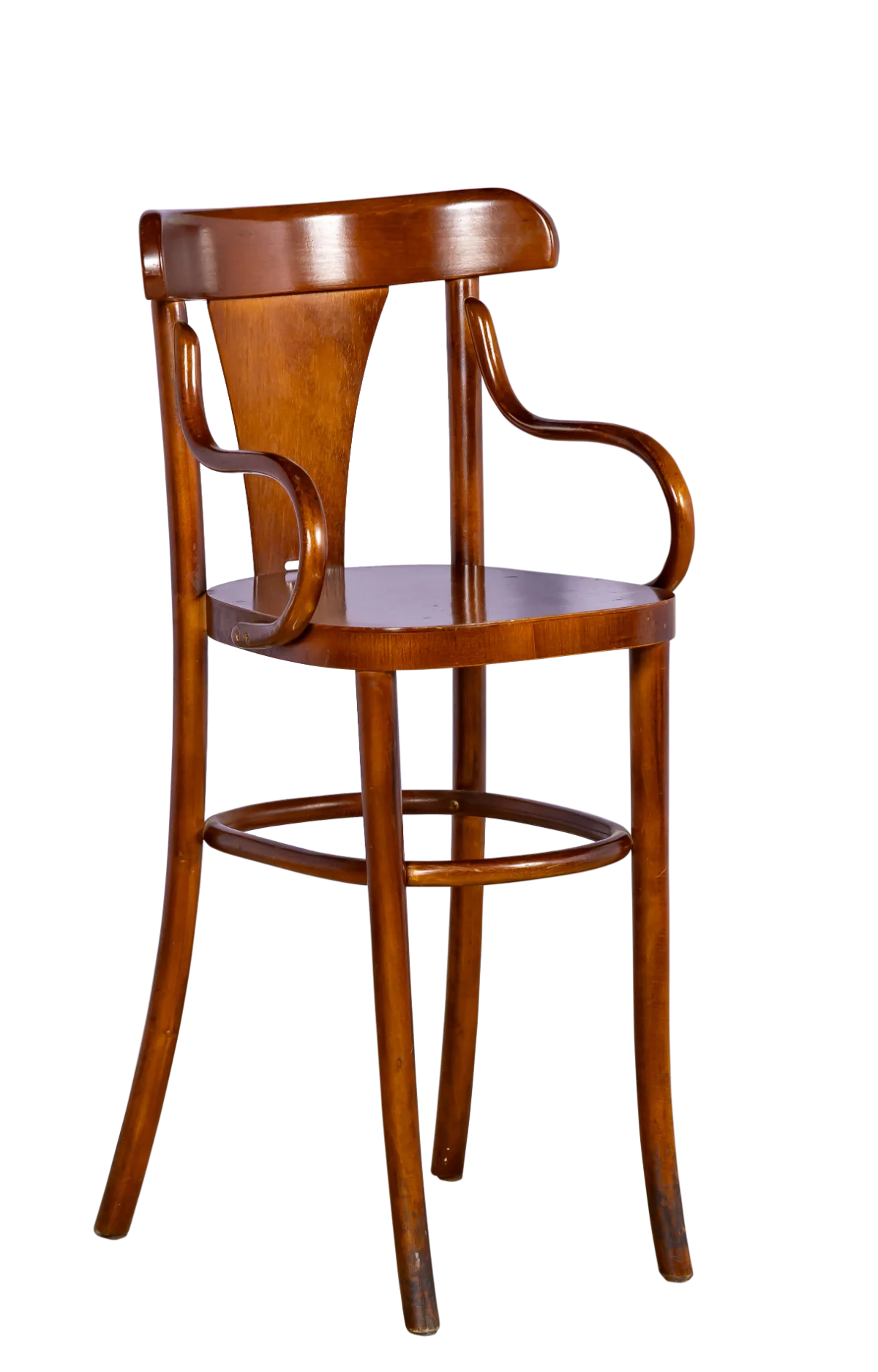 Cadeira alta infantil em madeira, estilo cadeirinha de restaurante.