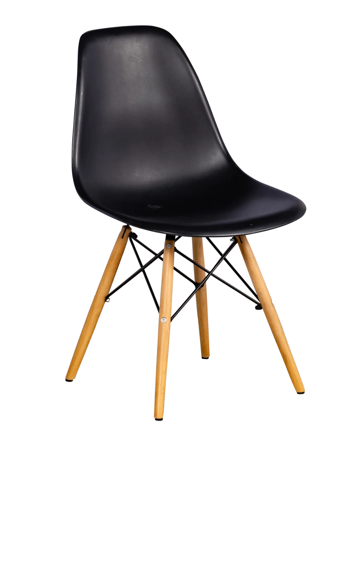 Cadeira modelo Eames em polipropileno na cor preta e pés em madeira.