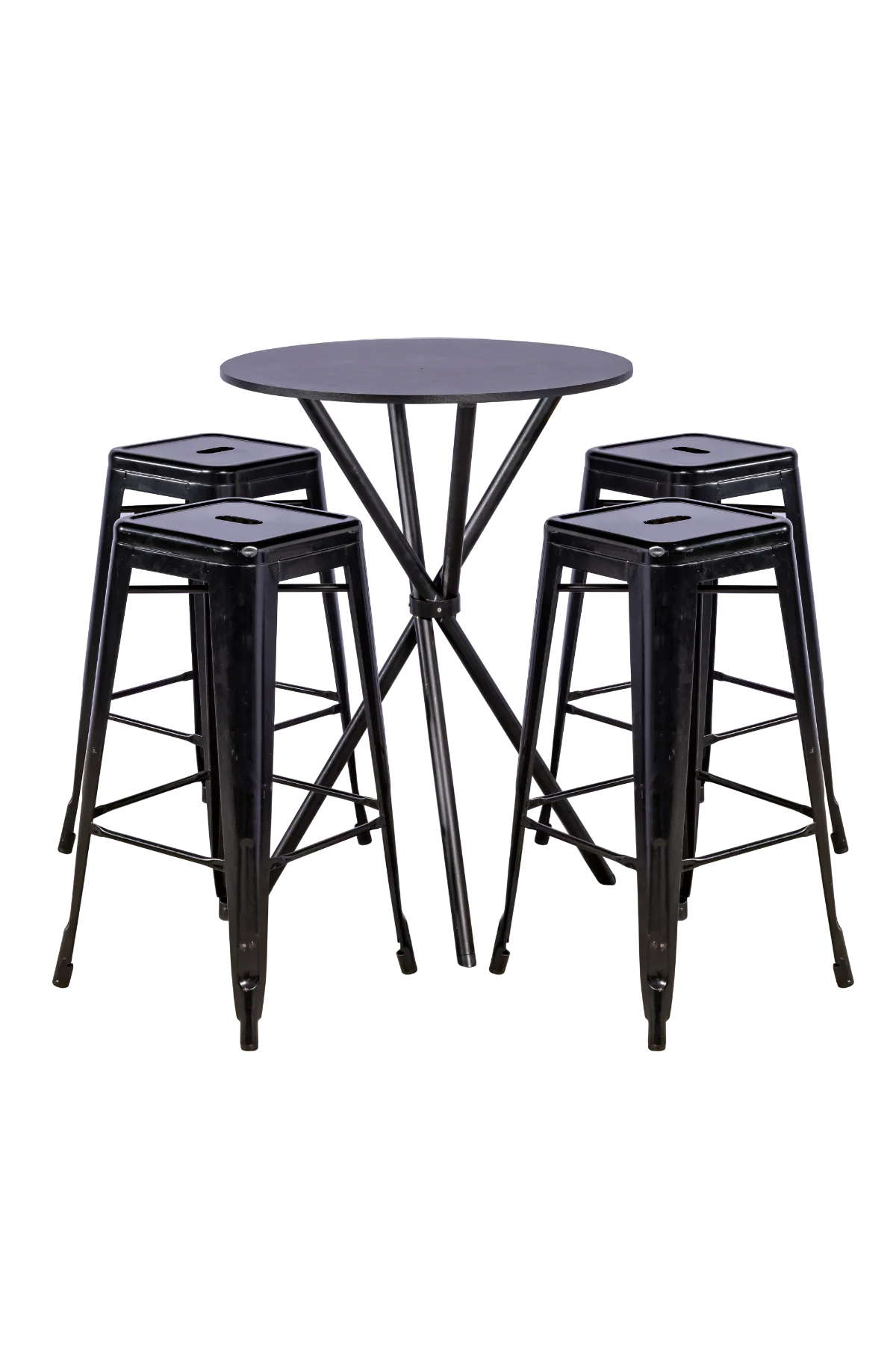 Mesas bistrô e banquetas são itens que se encaixam perfeitamente em eventos corporativos. Esse conjunto composto por mesa base fogueira e tampo redondo em MDF com banquetas Iron Tolix é perfeito.
