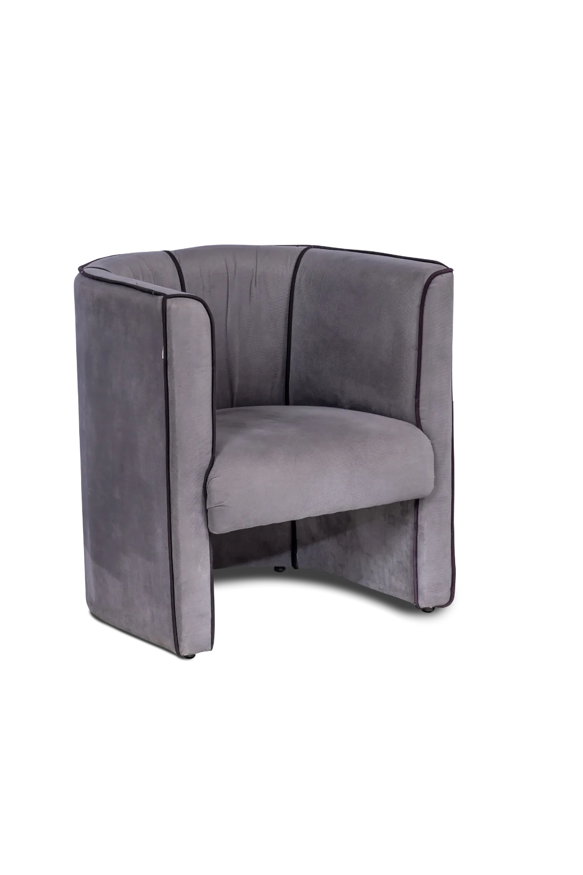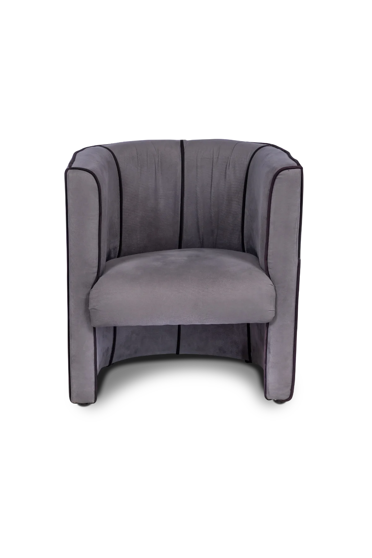 Poltrona fixa com encosto curvo em tecido veludo cinza com acabamento debrum preto.