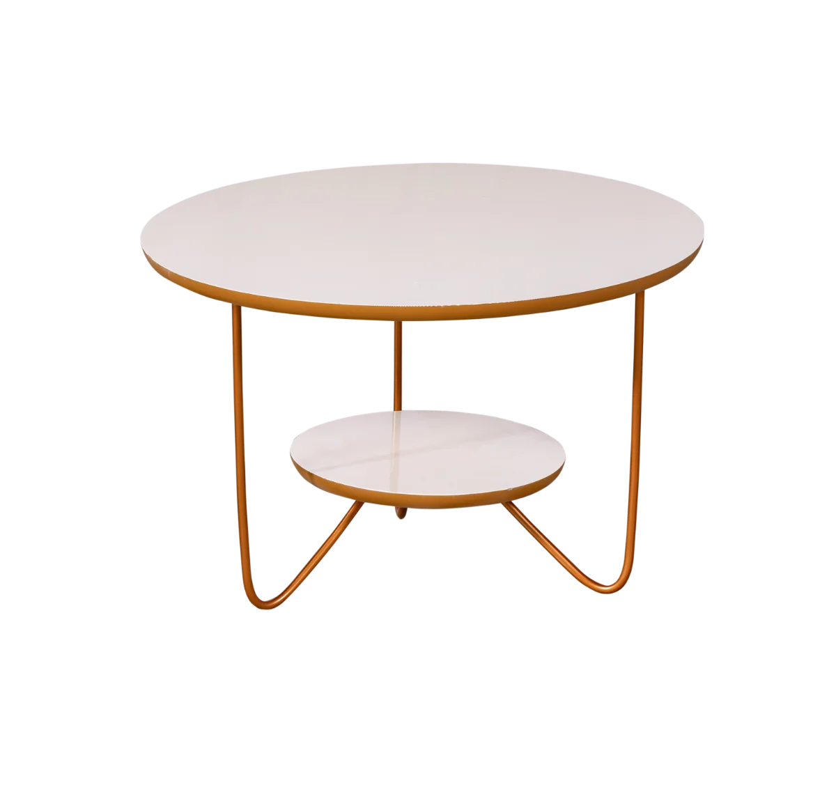 Lindo conjunto de mesas composto por centro e lateral, estrutura em metal bronze e tampos off white areia.
