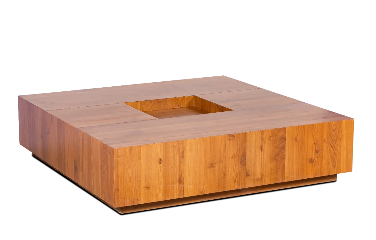 Mesa de centro quadrada em madeira com detalhe rebaixado no tampo.