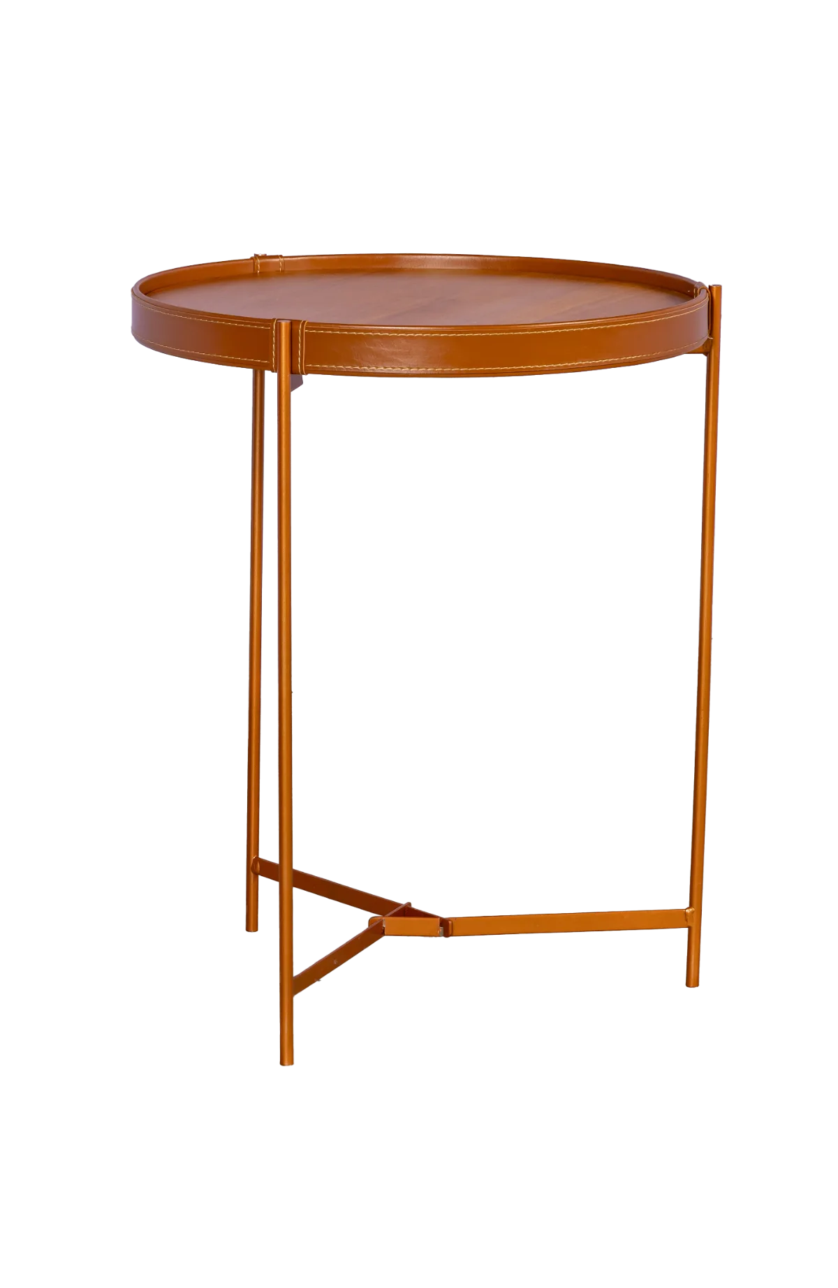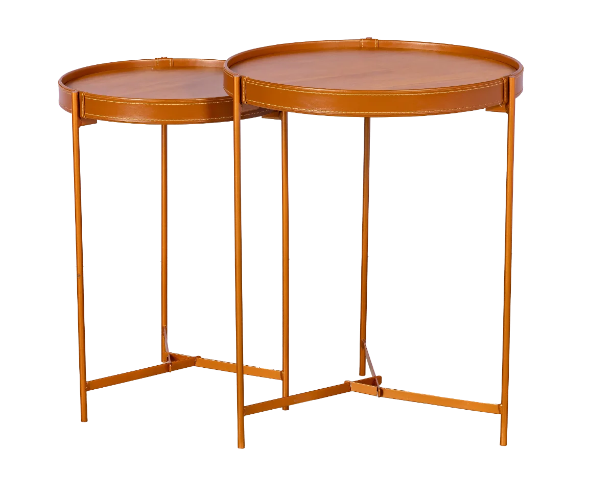 Conjunto mesas laterais linha Acqua em metal cobre e couro para locação