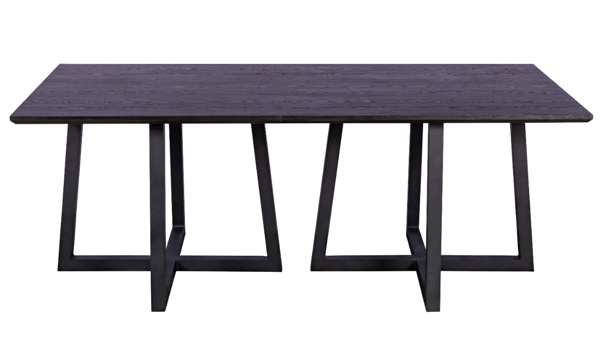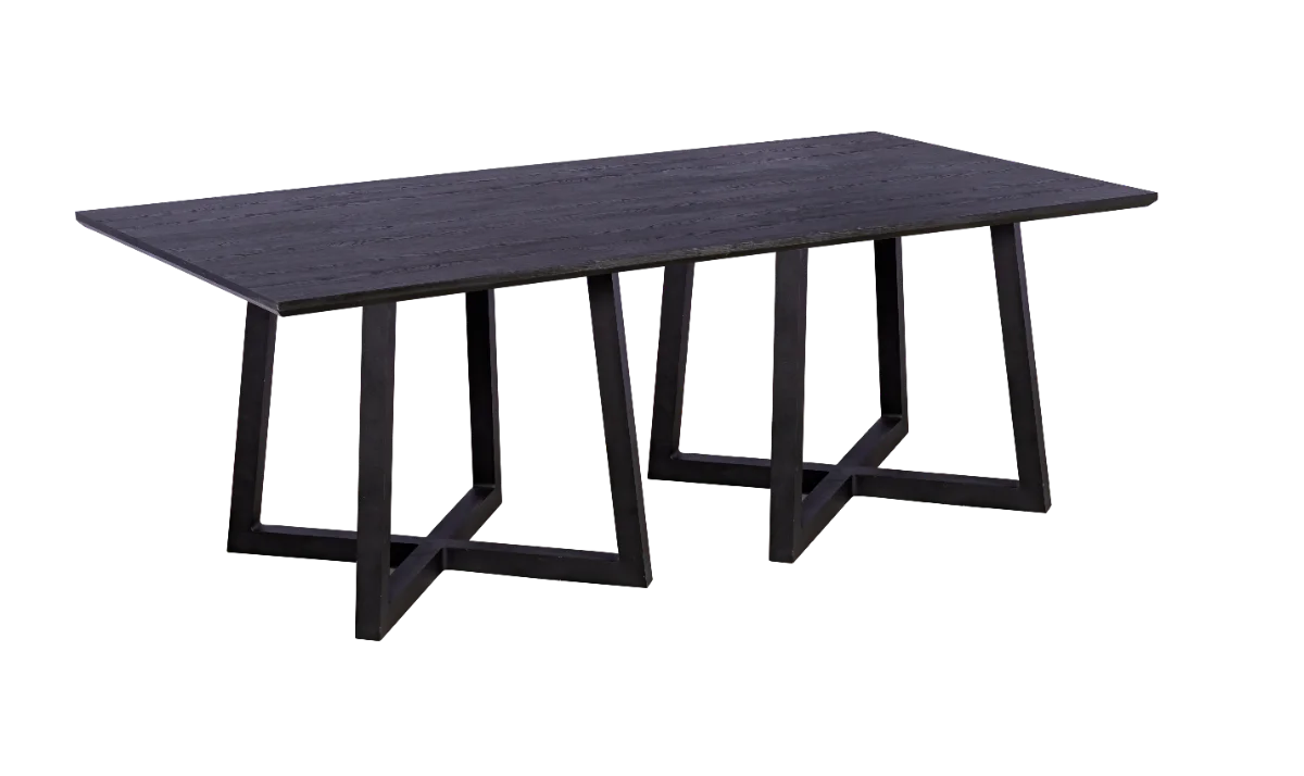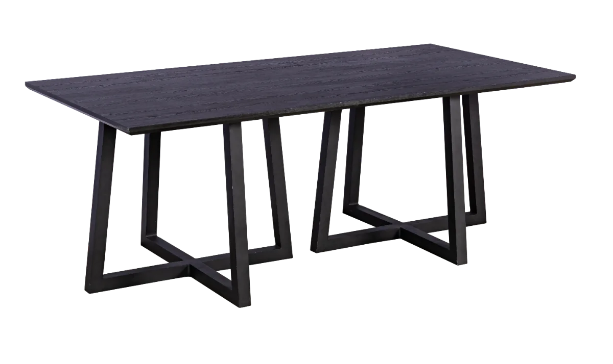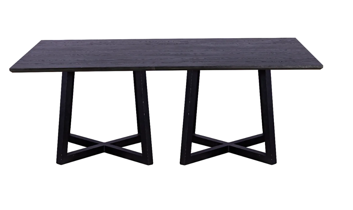 Linda mesa com base X em alumínio na cor preto e tampo em MDF madeirado com acabamento de borda em 45 graus na cor preto, aplicação para jantar ou buffet.