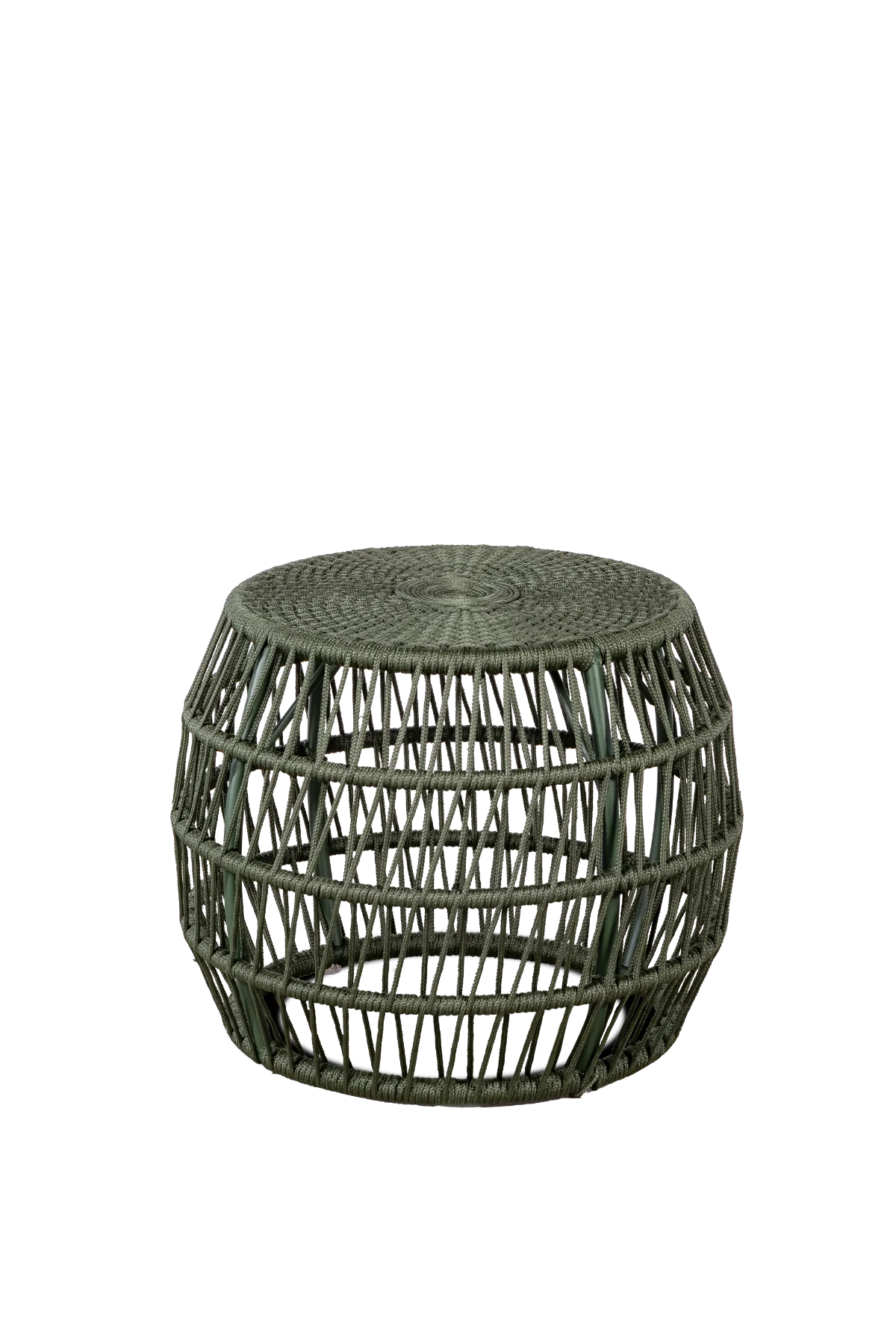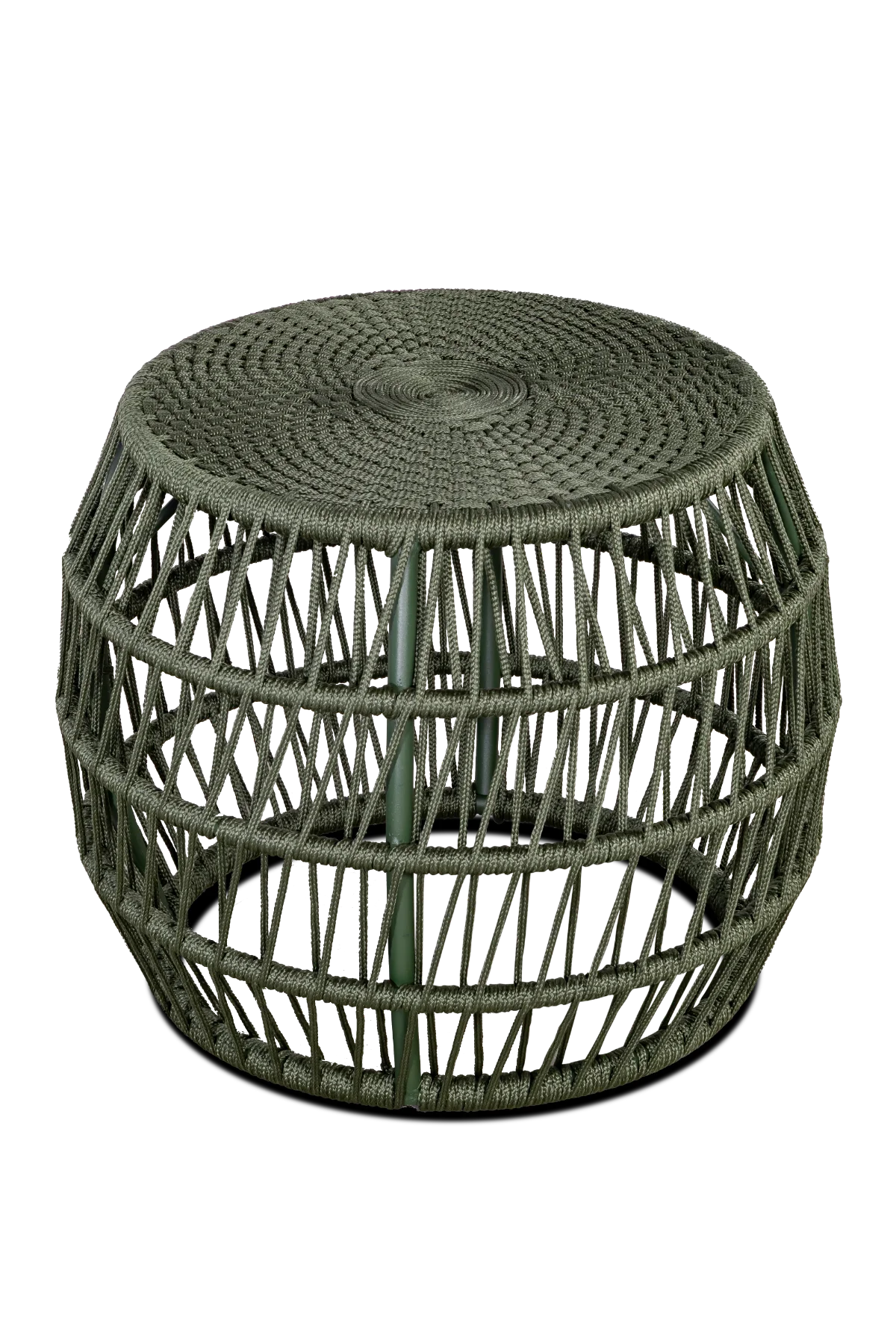 Puff com assento fechado, revestido em corda náutica na cor verde musgo, ideal para para ambientes interno ou uso ao ar livre.