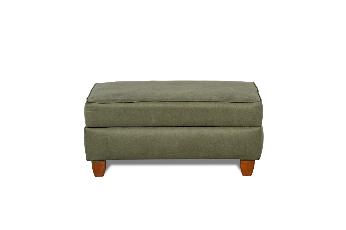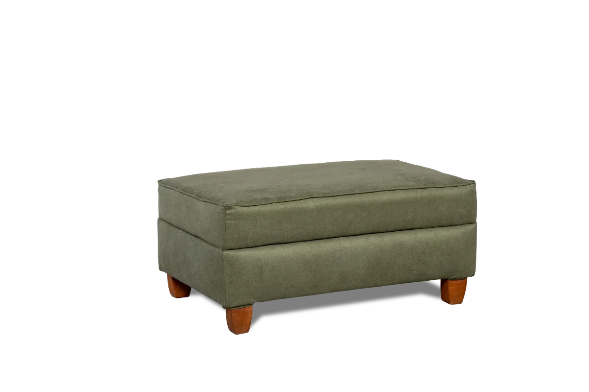 Lindo puff retangular, revestido em linho nobre na cor verde oliva, estrutura reforçada e pés em madeira natural.